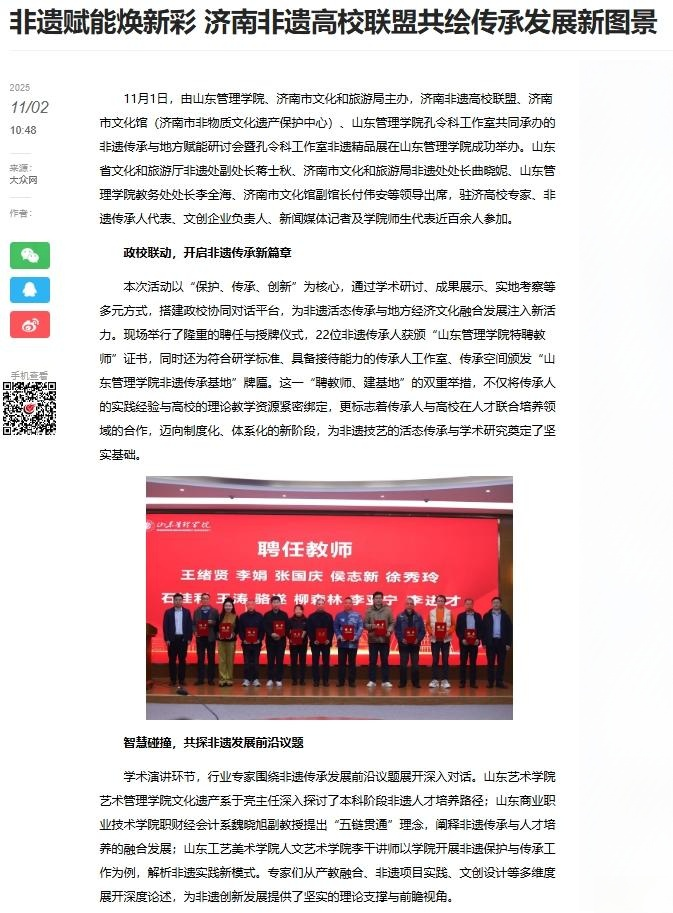 上一条:【大众报业·齐鲁壹点】非遗赋能焕新彩,济南非遗高校联盟共绘传承发展新图景