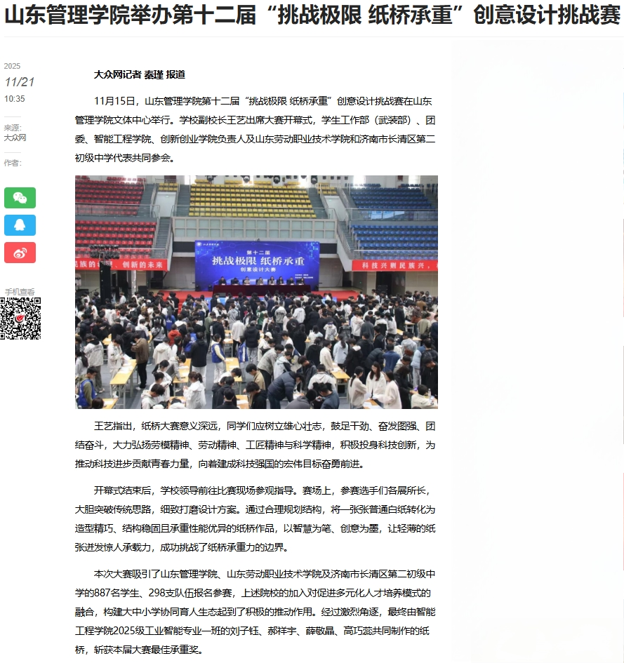 下一条:【中国教育在线】山东管理学院举办第二届“纸翼逐风 科创筑梦”模拟飞行大赛